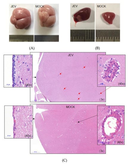 Macroscopically, multifocal lymphohistiocytic perivascular cuffs [17,18] and lymphohistiocytic meningitis [18] were observed in the brains collected from ducklings exposed to JEV-infected mosquitoes (Figure 3C, JEV) but not mock-infected mosquitoes (Figure 3C, MOCK), thus suggesting the presence of viral encephalitis in the affected ducklings. In the spleens collected from ducklings exposed to JEV-infected mosquitoes, as compared with JEV-infected mosquitoes, widened white pulp and atrophied red pulp were observed (Supplementary Figure S1B, JEV). In addition, fewer splenic cells were observed, some of which were deformed (Supplementary Figure S1C, JEV).