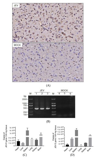 Given the presence of JEV encephalitis in the affected duckling brains, we examined JEV in the brains by immunohistochemical assays with antibodies specific to the JEV NS3 protein. The NS3 protein, shown as brown deposits in the cytoplasm by immunoperoxidase staining, was detectable in the cytoplasm of neuronal cells (marked with red arrows) in the brain sections (Figure 4A, JEV) from the ducklings exposed to JEV-infected mosquitoes but not mock-infected mosquitoes (Figure 4A, MOCK), thus demonstrating the presence of JEV in the affected duckling brains. To confirm this result, the brains were further examined by RT-PCR to detect the presence of the JEV E gene. As shown in Figure 4B, a band corresponding to the amplified size of the JEV E gene fragment was detected in the brains from all three ducklings exposed to JEV-infected mosquitoes but not mock-infected mosquitoes. Additionally, the viral loads in the brains and other tissues from the affected ducklings were determined by qRT-PCR. The JEV E gene was detectable in all tissues examined, with the highest copies in the spleens followed by the brains (Figure 4C,D).