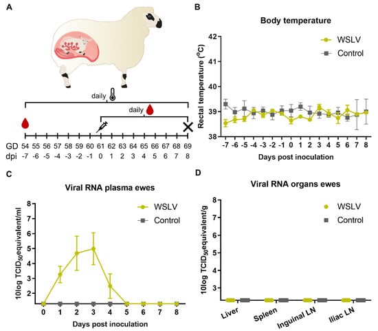 Wesselsbron virus (WSLV) infection in pregnant ewes. (A) Experimental set-up of pregnant ewe trial. Ewes were inoculated at gestation day (GD) 61. At 8 days post inoculation (dpi), the ewes were euthanized and necropsied. Rectal temperatures (B), viremia (C) and viral RNA in the organs of the ewe (D) are depicted. Error bars represent averages with standard deviation (SD).