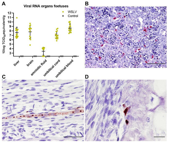 Necropsy of the foetuses revealed no macroscopic differences between the foetuses of the WSLV-infected group and the control group. RT-qPCR analysis of foetal liver, brain, amniotic fluid, umbilical cord and plasma samples revealed the presence of high levels of viral RNA, except for the amniotic fluid samples (Figure 3A). WSLV antigen was not detected by IHC in the umbilical cord, suggesting that the viral RNA that was detected in umbilical cord homogenates originated from the foetal blood. WSLV was detected in foetal hepatocytes (Figure 3B) and sporadically in striated muscle fibres and osteoblasts (Figure 3C,D).