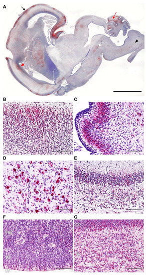 Most interestingly, WSLV antigen was immunohistochemically detected throughout the foetal brain, including the telencephalon, diencephalon, mesencephalon, metencephalon and myelencephalon (Figure 4A). Infected differentiated neurons were observed in all parts of the brain, such as the pyramidal cells in the cortical plate, purkinje/granule cells in the cerebellar cortex, motoric neurons in the brain stem and pyramidal neurons of the hippocampus (Figure 4B–E). In addition, WSLV antigen was found in the ventricular and subventricular zone where radial glial cells and neural progenitor cells divide and proliferate (Figure 4F). Infection of nondifferentiated neuroblasts and glial precursor cells migrating from the (sub)ventricular zone to the cortical plate caused an abundant staining for WSLV in the intermediate zone (Figure 4G).