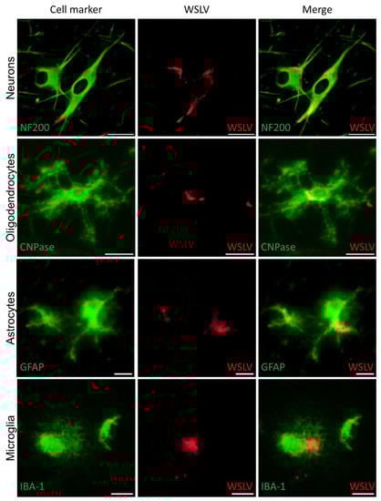 Identification of WSLV-infected foetal brain cells. Double immunofluorescent microscopy images of foetal brains to identify WSLV-infected cells. Cell markers are indicated in green, WSLV antigen in red. Neurons were visualised using anti-Neurofilament 200 (NF200), oligodendrocytes by anti CNPase, astrocytes using anti Glial Fibrillary Acidic Protein (GFAP) and microglia using anti IBA-1. Bars are 50 µm (neurons), 20µm (oligodendrocytes) or 10 µm (microglia and astrocytes).