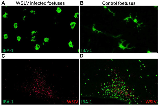 To specifically identify the different cell types in the brain that are targeted by WLSV, double immunofluorescent stainings were set up in which various cell markers and WSLV antigen can be detected simultaneously. These experiments confirmed that foetal neurons are the primary target cells of WSLV (Figure 5). In addition, WSLV antigen was detected in all types of neuroglial cells: oligodendrocytes, microglia and astrocytes (Figure 5). Microglial cells in WSLV-infected foetuses had adopted a rounded, amoeboid shape in contrast to the ramified microglia found in mock-inoculated foetuses, suggesting activation of microglia following neuroinvasion by WSLV (Figure 6A,B). Activated microglia were seen invading sites of WSLV infection in the brain (Figure 6C,D), leading to the formation of microglial nodules throughout the brain.