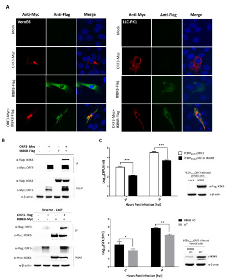Through a proteomic-based approach, we identified IKBKB as one of the ORF3 interacting partners in HEK293T cells [7]. Here, we showed that these two proteins indeed colocalized in both type I IFN incompetent VeroE6 and type I IFN competent LLC-PK1 cells (Figure 1A). Co-immunoprecipitation and reverse co-immunoprecipitation also confirmed that PEDV ORF3 protein strongly interacted with IKBKB (Figure 1B). As ORF3 has been proposed to play a role in regulating PEDV virus replication [10,11], we speculated that the overexpression of IKBKB might also affect PEDV replication. PEDVAV12_ORF3 [12] replication was, therefore, determined in VeroE6 cells overexpressing IKBKB. As expected, we observed that the expression of IKBKB significantly suppressed PEDV replication in VeroE6 cells (Figure 1C). To assess whether the presence of endogenous IKBKB affects PEDVAV12_ORF3 replication, IKBKB-knockout VeroE6 cells were generated and infected with PEDVAV12_ORF3. In agreement with the results found in transfected cells, PEDVAV12_ORF3 replication in IKBKB-knockout cells was more efficient than that in wild-type counterparts (Figure 1C).