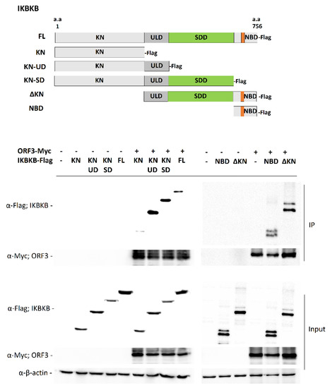 Detailed analysis of ORF3–IKBKB region interaction. Schematic representation showing the full-length IKBKB and those with truncated constructs (upper panel). The plasmid expressing ORF3-Myc was co-transfected with plasmids expressing each of truncated IKBKB with Flag-tag at C-terminus in HEK293T cells. At 24 hpt, cleared lysates were subjected to immunoprecipitation using anti-Myc beads. The immunoprecipitated proteins were probed with rabbit anti-Flag and anti-Myc antibodies. KN, Kinase domain; ULD, ubiquitin-like domain; SDD, scaffold/dimerization domain; NBD, NF-κB essential modifier (NEMO) binding domain; ΔKN, deleted kinase domain.