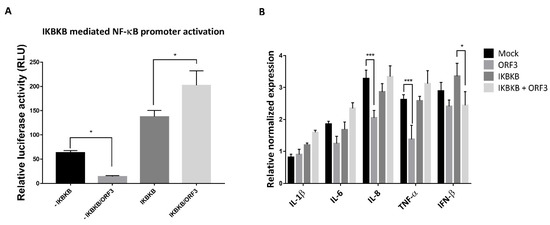 ORF3 increased the activation of IKBKB-meditated NF-κB promoter activity. (A) HEK293T cells were grown in 24-well plates and transfected with plasmids expressing ORF3, IKBKB, firefly luciferase driven NF-ҡB promoter and Renilla luciferase. At 24 hpt, cells were treated with 50 ng/mL TNF-α for 8 hrs. Cells were then lysed, and the firefly luciferase and Renilla luciferase activities were measured. Data (n = 3) were shown as the relative firefly luciferase activities normalized to the Renilla luciferase activities. *, p < 0.05. (B) LLC-PK1 cells were transfected with the plasmid expressing IKBKB or/and ORF3 for 24 h following with TNF-α treatment (50 ng/mL) for 8 hrs. Cells were lysed and subjected to total RNA extraction. The RT-qPCR was performed to detect the relative expression of cytokine mRNA. Relative mRNA expression (n = 3) of cytokine mRNA was normalized with the internal control β-actin. Error bars indicated mean± standard error of means of relative normalized mRNA expression from duplicate experiments. *, p < 0.05; ***, p < 0.001.