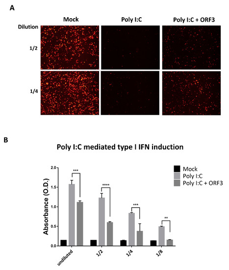 ORF3 inhibits Poly I:C mediated type I interferon production and induction. HEK293T cells were transfected with Poly I:C and ORF3. Cells transfected with empty plasmid were used as mock transfection. At 24 hpt, undiluted and serial 2-fold dilutions (1/2 and 1/4) of supernatants were collected and incubated in PK-15 cells for 24 hrs. After incubation, cells were infected with VSV-mCherry. Spreading of the virus in the cell monolayer was monitored by the detection of mCherry fluorescence with fluorescence microscopy (A). (B) Undiluted and serial 2-fold dilutions (1/2, 1/4 and 1/8) of supernatants (n = 3) were added into 96-well plate containing HEK-BlueTM IFN-α/β cell suspension. After incubation for 24 hrs, induced HEK-BlueTM IFN-α/β cell supernatants were used to measure type I IFN induction through JAK-STAT pathway activation by a secreted embryonic alkaline phosphatase (SEAP) detection following the manufacturer’s protocol. The SEAP levels were quantified using a spectrophotometer at 655 nm. Error bars indicated mean ± standard error of means of absorbance values. **, p < 0.01; ***, p < 0.001; ****, p < 0.0001.