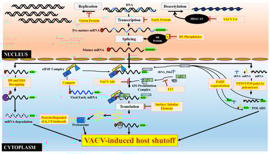 A pre-mRNA contains coding exons and noncoding introns. During the maturation of pre-mRNA, the introns are removed, and exons are joined through a process called splicing. VACV genes lack introns; hence, splicing is dispensable for VACV. However, VACV can target host-splicing machinery to induce host shutoff. The serine (S)/arginine (R)-rich protein (SR protein) family is an important protein family that is required for spliceosome assembly [76]. SR proteins are hyper-phosphorylated at a serine residue that is required for its function [77]. VACV-encoded protein phosphatase H1 may inactivate SR protein, thereby dysregulating the host cell’s RNA splicing machinery. The incubation of VACV H1 with SR protein from HeLa cell lysate de-phosphorylates SR protein, while the mechanism in VACV-infected cells has not been elucidated [78]. Since splicing is not required for VACV, it likely selectively inhibits cellular mRNA splicing that contributes to host shutoff without interfering with viral mRNAs (Figure 1).
