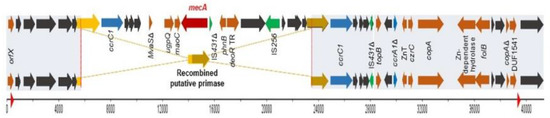 Both strains aligned partially with SCCmecV (5C2&5)c and differed only in a gap of 17342bp, present in the C6829 strain, because of a putative primase recombination (Figure 2). The presence of SCCmec remnants has been previously described in S. aureus CC398 isolates of humans and animals [8,9], as well as in human isolates of other lineages [10,11], suggesting potential evolutionary and adaptive steps. Moreover, the mecA gene can be lost during the storage process [12]. The conversion from MRSA to MSSA has been reported as a result of a recombination event between ccrC genes [8,9]. In addition, it has been described that IS431 elements could be involved in the deletion of SCCmec fragments in MRSA isolates, in parallel to the acquisition of a vancomycin-intermediate-resistance phenotype [10,13].