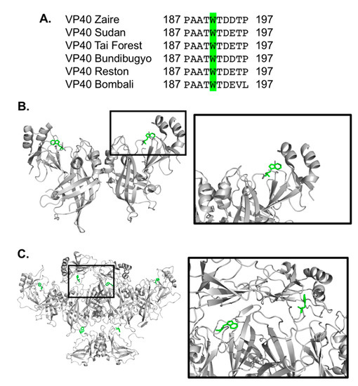 eVP40 has a conserved tryptophan at position 191. (A) Clustal W was used to align the amino acid sequences of eVP40 from six different types of ebolavirus. The alignment between residues 187 and 197 is shown with the conserved tryptophan residues (Trp191) highlighted in green. (B) The eVP40 dimer structure (PDB ID: 4LDB) was used to highlight the position of Trp191, which is situated near a C-terminal domain (CTD) region beneath Lys274 and Lys275, which are important for eVP40 plasma membrane binding [13,15]. (C) The VP40 hexamer structure (PDB ID: 4LDD) was used to model in the missing CTDs (Modeller software) to highlight the position of Trp191 in the proposed hexamer structure. Figure 1B,C were prepared in Pymol.