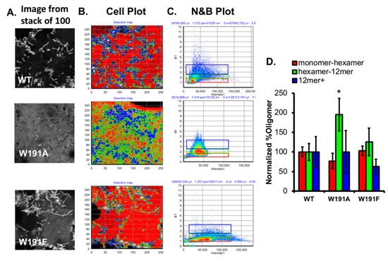 eVP40 oligomerization is a hallmark of its ability to form pre-VLP structures that emanate from the plasma membrane [12,14,15,18]. Proper oligomerization of eVP40 from the dimer to a hexamer [12,15] and larger oligomers [12,14,18,19,20] has been proposed to be a key step in proper egress and virion formation, as mutations that reduce oligomerization or alter hydrophobic contacts that facilitate proper CTD oligomer contacts reduce budding [15,16,17]. To monitor the effects of W191A and W191F on VP40 oligomeric state, we employed number and brightness (N&B) analysis, which has been used to study the apparent oligomerization state of GFP tagged proteins [31,32,33], including previous work on VP40 [12,14,18,19,20]. COS-7 cells expressing WT, W191A, or W191F as EGFP fusions were imaged using a raster scan for 100 frames (Figure 3A) and the resulting images were analyzed using Globals software (SimFCS, E. Gratton, UC Irvine Laboratory for Fluorescence Dynamics, Irvine, CA, USA) and the N&B analysis package. In line with previous studies [12,14,18,19,20], WT VP40 exhibited significant oligomerization at sites of pre-VLP formation (Figure 3A,C). WT VP40 exhibited significant populations of hexamer–12mers (green), and 12mers and greater (blue) at pre-VLP sites (Figure 3A,C). To visualize the differences more simply between WT and mutant oligomerization, WT VP40 oligomerization was normalized to 100% for all three oligomer sizes monitored to detect changes in W191A or W191F oligomerization.