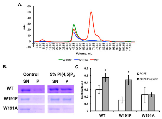 WT VP40 and Trp191 mutant dimer and octamer propensity and lipid binding analysis. (A) Size exclusion chromatography was performed post-affinity chromatography for WT VP40 (red), W191A (green), or W191F (blue). WT exhibited the characteristic dimer peak between 67 and 71 mL as well as an octamer peak at 47–51 mL. In contrast, W191A and W191F were predominantly octamers and dimer populations were barely detectable. The size exclusion column was routinely calibrated with high molecular weight standards from Cytiva (43,000–669,000 Da) (Marlborough, MA, USA). (B) A vesicle binding assay was performed as previously described [14] for WT, W191A, and W191F using control and PI(4,5)P2 containing vesicles where the bound (P—pellet) and unbound (SN—supernatant) fraction were separated by centrifugation. (C) Quantification of three independent experiments for the fraction of VP40 or mutant bound to control or PI(4,5)P2 containing vesicles. * p < 0.05.