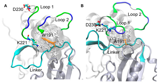 Molecular dynamics (MD) simulations have been used to investigate VP40 structural dynamics [16,17], VP40–lipid interactions [36,37], and to better understand cellular and experimental observations of VP40 structure/function relationships [13,38,39]. To determine how Trp191 may influence VP40 flexibility and interactions adjacent to Trp191, we performed MD simulations for WT VP40 and W191A. For the WT, residues in what we refer to as loop 1, containing key lipid-binding residues Lys224 and Lys225, are quite flexible (Figure 5A and Supplementary Materials Video S1) whereas loop 2 residues (Lys274 and Lys275) are more restricted in their movements. The linker region between the NTD and CTD is also quite rigid and lacks flexibility in the WT simulations. However, simulations with the W191A mutant exhibited a K221–D230 salt-bridge form that staples loop 1 in a much more restrained conformation (Figure 5A, Figure 6, and Supplementary Materials Video S1), significantly affecting the flexibility of the loop 1 residues. In contrast, loop 2 flexibility does not appear to change considerably in W191A but does have a slight change in orientation. The linker region between the NTD and CTD is much more flexible (Figure 5, Figure 7, and Supplementary Materials Video S1) in W191A, which may partially explain the greater propensity of octamer formation for the W191A construct. The increased flexibility may destabilize the interdomain interactions and affect the CTD disengagement from the NTD. Diminished membrane binding and enhanced CTD disengagement would be expected to increase VP40 octamer ring formation, plasma membrane localization, and reduced VLP formation.