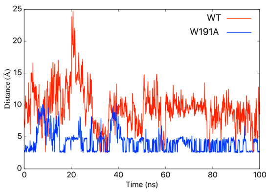 The hydrogen bond (N–O) distance between Lys221 and Asp230 side chains. MD simulations predicted changes in the distance between N–O in the Lys221 and Asp230 side chains for WT (red) and W191A (blue) VP40.