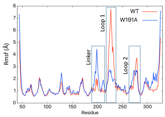 The root-mean-squared fluctuations (Rmsf) of VP40 residues in WT and W191A VP40. MD simulations predicted changes in the Rmsf in Å for different residues in WT (red) and W191A (blue) VP40. The regions for the NTD–CTD linker, Loop 1 and Loop 2 display the most significant changes in fluctuations between WT and W191A.
