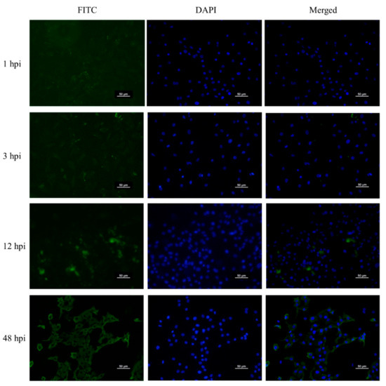 The internalization of FIPV WSU 79-1146 at a multiplicity of infection (MOI) of 1.0 in Crandell-Rees Feline Kidney (CrFK) cells at different hours post-infection (hpi) was observed with a fluorescence microscope (Figure 1). At 1 hpi, fluorescein isothiocynate (FITC)-conjugated antibody targeting the nucleocapsid of FIPV was detected at a very low intensity, which indicated that the entry of the virus into the cells was at the early stage. The intensity of FITC was gradually increased and observable in infected cells at 3 hpi. This might have indicated that the virus was moderately internalized into the cells after 3 hpi. The virus was internalized and replicated in the cells, which was represented by the high intensity of fluorescence observed at 48 hpi.
