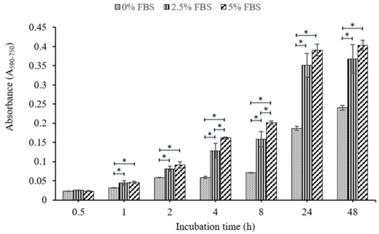 Absorbance (A590–750) comparison between different percentages of fetal bovine serum (FBS) (0%, 2.5% and 5%) in the incubation of CrFK cells at different time points, up to 48 h. The data represent the mean ± SD of three independent experiments. For each incubation period, means with * were significantly different (p < 0.05), from other FBS concentrations. Statistical analysis was performed by ANOVA test, followed by post hoc Tukey test.