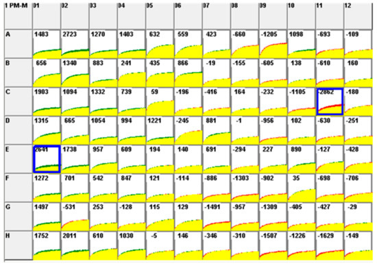 Comparison of metabolism rate between FIPV-infected CrFK cells (Green) and non-infected CrFK cells (Red) in PM-M1 plates for 24 hour post-infection (hpi). The yellow color indicates overlapping responses. The value displayed in each well indicates the difference of metabolism rate among the two assay conditions. The median value of this PM-M1 plate is 2343. Wells highlighted in Blue indicate significant metabolic activity in the corresponding metabolites among the two assay conditions (C11 = palatinose; E1 = melibionic acid).