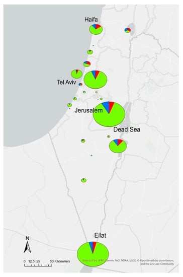 Geographic distribution and number of samples obtained from the 168 hotels and resorts included in the study. Samples are represented as pie charts at different locations; the size is proportional to the number of samples obtained from a specific location. Negative samples are shown in green, and positive and exceeding samples are shown in blue and red, respectively. Four major tourist sites with the largest number of samples (negative/positive/exceeding the regulatory thresholds) are Eilat (695/38/34), Jerusalem (662/71/52), the Tel-Aviv region (384/31/32) and the Dead Sea region (210/28/32).