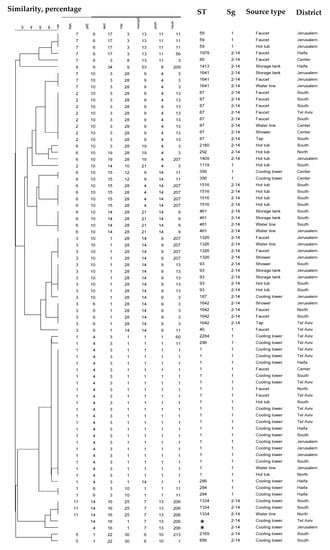 Concerning the geographical distribution of the Lp population in this study, we observed a relative abundance of a number of strains in some districts in Israel. For example, sequence type ST1 was identified in each of the six Israeli districts, and ST1642 was found in four of the districts. On the contrary, other subtypes were associated with only one geographical region. For example, ST59, ST1326, and ST1641 were found in the Jerusalem district, and ST1516 was limited to the Southern region. Even though these strains are not unique to Israel, apart from ST1641, we observe their strong association with these two regions from our surveillance programs and during epidemiological investigations []. An explanation might be water-related differences between the regions (i.e., physical and chemical properties) caused by the climatic and topographical characteristics of the geographic regions. However, more data is needed to verify this assumption.