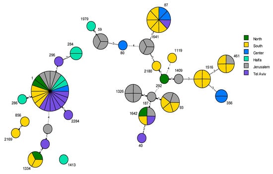 While several L. pneumophila sequence types were distributed widely throughout the country (ST1, ST1642, and ST461), a number of strains have been found to be limited to certain geographical regions. Specifically, ST59, ST1326, and ST1641 were unique to the Jerusalem district, and ST1516 was only found in the Southern region. Moreover, the Southern and Jerusalem districts displayed the most diverse L. pneumophila population, with 11 and 10 different STs, respectively (Figure 3).