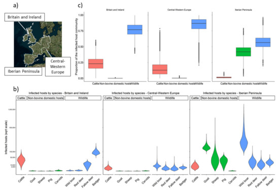 The estimated composition of the community of infected hosts differs widely amongst the three regions (Figure 1b,c). In Britain and Ireland, it is dominated by badgers and cattle (Simpson’s index D = 0.536), while in Central–Western Europe, it is more diverse (D = 0.328), being dominated by wildlife and cattle. In the Iberian Peninsula (D = 0.318), the community of infected hosts is split more equally between wildlife (notably wild boar) and non-bovine domestic species. Non-bovine domestic and wild species constitute the majority of the community of infected animals in all three study regions, despite large regional variations (Table 2).