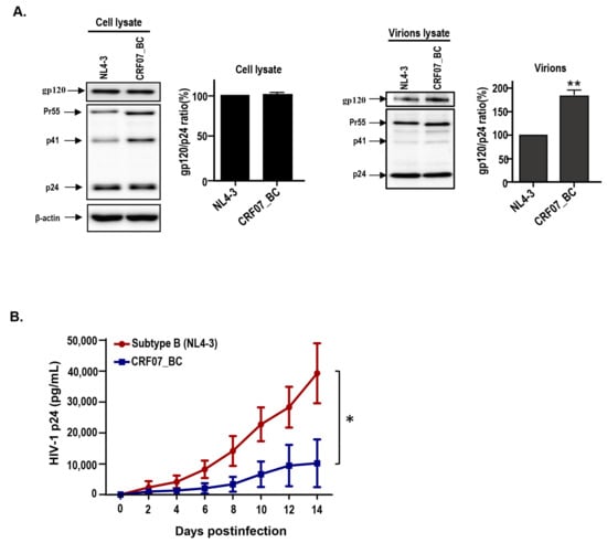 Viral characteristics of HIV-1 CRF07_BC infectious clones. The pNL4-3 and pCRF07_BC were transfected into HEK293T cells and the viral supernatants were subjected to (A) immunoblot analysis of cell lysates (the left) and virion lysates (the right) with indicated antibodies. Immunoblot band intensities were quantified by densitometry. The ratio of gp120/p24 was calculated based on results from the densitometry measurement. (B) Viral growth kinetics was conducted using phytohemagglutinin (PHA)-activated peripheral blood mononuclear cells (PBMCs), from healthy donors, infected with B subtype NL4-3 and CFR07_BC strains. The viral supernatants were collected at different time points and subjected to HIV-1 p24 determination. Results shown are the mean of four independent experiments (* p < 0.05; ** p < 0.01).