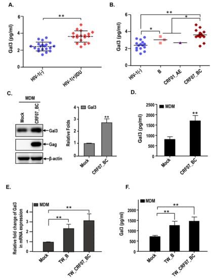 Next, we address the potential correlation between galectin-3 and CRF07_BC. The serum samples were collected from HIV-1(−) healthy donors and HIV-1(+) IDU groups and subjected to enzyme-linked immunosorbent assay (ELISA). The control group was selected from HIV-1(-) individuals with age and gender matching to the HIV-1(+) IDUs group. Results indicate that significantly higher serum galectin-3 in HIV-1+ IDUs, compared to the healthy control group, was detected (p < 0.01) (Figure 2A) and significantly higher serum galectin-3 level was measured in CRF07_BC infected patients compared to the patients infected with subtype B and CRF01_AE (Figure 2B). Furthermore, we found that HIV-1 CRF07_BC infection induced galectin-3 expression in the monocyte-derived macrophage (MDM) (Figure 2C), as well as, significantly triggered galectin-3 secretion to the culture medium compared to the mock (p < 0.01) (Figure 2D). This phenomenon was further confirmed by using clinical isolates, subtype B (TW_B) and CRF07_BC (TW_CRF07_BC) infected MDMs, demonstrating that TW_CRF07_BC infection induced a significantly higher galectin-3 expression detected in mRNA and supernatant proteins compared to the mock (p < 0.01). Similar results were observed in TW_B infected groups (Figure 2E,F).