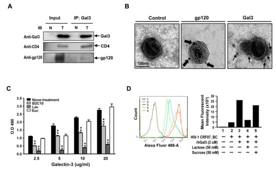 Virus, gp120 or CD4 recombinant protein coated ELSA and co-immunoprecipitation assays were used to evaluate the interaction between galectin-3 and CRF07_BC or galectin-3 and gp120 or gp120 and CD4. The details of these assays were shown in the supplement.
