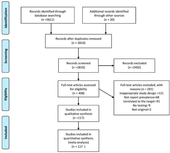 As showed in Figure 1, 5631 articles were found in the original search. After the removal of duplicate data, 2810 articles were selected for screening. After reviewing the title and abstract, 408 articles were selected for full text study. A total of 291 articles were excluded for various reasons, including inappropriate study design (121), failure to report prevalence (68), irrelevant target group (91), lack of proper testing (9) and non-originality (2). Eventually, after qualitative evaluation of data, 117 articles that had reported 161 records of HIV, HCV, HBV prevalence and their co-infections (HIV/HCV, HIV/HBV, HCV/HBV, HIV/HCV/HBV) among PWID and FSWs were analyzed. The characteristics of the studies are shown in Table 1. A total of 26 papers with 40 records had been published in the South-East Asia region, 25 papers with 32 records in the Americas region, 21 papers with 28 records in the Europe region, 17 papers with 19 records in the Africa region, 15 papers with 18 records in the Eastern Mediterranean region and 13 articles with 24 records in the Western Pacific region. A total of 89 papers with 119 records had been conducted on PWID and 33 papers with 42 records on FSWs.