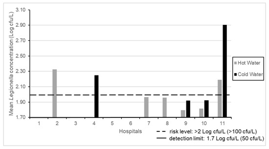 The results of mean Legionella concentrations found in 52 SHWOs from 11 hospitals are shown in Figure 1. Seven of the hospitals showed Legionella contamination (7/11, 63.6%), where three (3/7, 42.8%) of them showed values over the level of risk indicated by Italian Guidelines, that is, at >100 cfu/L (>2 Log cfu/L) [12]. The contamination was found in hot or cold samples and in both water distribution systems for each hospital.