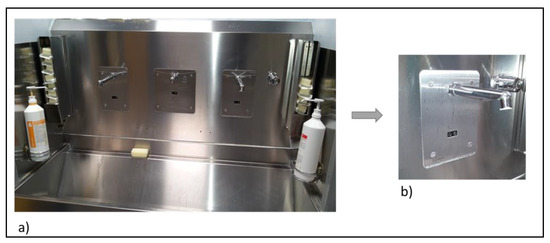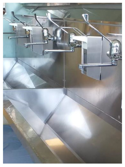 The key factors for prevention of HAIs in the surgical area are associated with hand hygiene, surgeon handwashing characteristics, and appropriately timed glove use. Hand hygiene is an extremely important measure implemented to reduce HAIs; the WHO published guidelines in 2006 and in 2009 for routine and surgical hand hygiene protocols directed to control resident flora as well as transient microflora [14,15]. There are two primary methods for hand hygiene: antimicrobial or non-antimicrobial soap and water scrub, called the “scrub method”, and Alcohol-Based Hand Rub, called the “rub method” [16]. Concerning the surgeon handwashing station characteristics, they are generally made entirely of stainless steel with a tank made of a single plate to guarantee the continuity of the surfaces and to avoid all possible areas of bacterial proliferation (e.g., spaces or grooves). The front part is slanted by 30° in order to prevent splashing and direct water contact with operators [17].