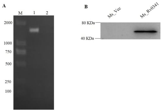 Rv0341 protein was ectopically expressed in M. smegmatis. (A) The 1440 bp Rv0341 gene detected in Ms_Rv0341, Lane M (DNA ladder marker), Lane 1 is the band of Rv0341 gene, and Lane 2 is the negative control (Ms_Vec). (B) Western blot detection of Rv0341 protein expression in M. smegmatis.