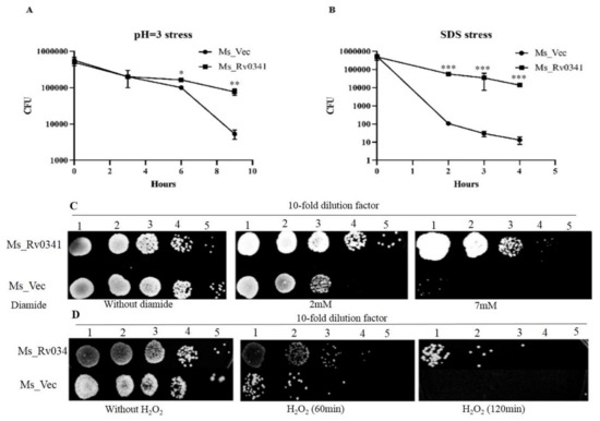 Rv0341 transcription was upregulated in macrophages isolated from the granuloma of TB patients, suggesting a role in the survival of the pathogen in harsh microenvironments []. In addition, alteration of M. smegmatis colony morphology was associated with resistance to stress []. Therefore, we analyzed the effect of Rv0341 on Mycobacterium survival in multiple in vitro stresses, where Ms_Rv0341 and Ms_Vec showed similar survival rate under a pH 5 stress condition (data not shown). Nevertheless, Ms_Rv0341 was significantly more resistance to pH 3 stress than the Ms_Vec strain at 6 and 9 h upon acid treatment (Figure 3A). Ms_Rv0341 survival was higher than the Ms_Vec (Figure 3B) upon exposure to 0.05% SDS. This was true for the exposure to diamide (Figure 3C) and H2O2 (Figure 3D). These data suggest that Rv0341 can enhance the Mycobacterium resistance to various stresses.