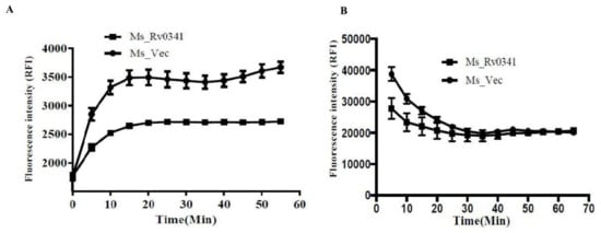 Rv0341 reduced the cell wall permeability of Mycobacterium. Accumulation of ethidium bromide (EtBr) and Nile Red dyes were used to analyze the cell envelope permeability of recombinant M. smegmatis strains. The ε-caprolactam-induced Ms_Rv0341 and Ms_Vec growth were collected, washed three times, and suspended in sterile phosphate buffer saline (PBS) to an OD600 of ~0.8. Next, the bacterial suspension was treated with 2 μg/mL EtBr (A,B) 20 μM Nile Red dye, and the fluorescence intensity was measured in appointed time using a FLUOstar OPTIMA microplate reader.