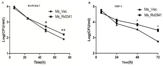 Rv0341 has been found expressed within macrophages isolated from the granuloma of TB patients [], and the Rv0341 protein can be detected upon in vitro infection of the macrophages by Mtb []. To test whether Rv0341 can affect Mycobacterium survival within macrophages, the intracellular survivability of Ms_Rv0341 and Ms_Vec was monitored in RAW264.7 macrophages and THP-1 macrophages. Four hours post-infection, the extracellular bacteria were eliminated via washing three times with RPMI-1640 medium and treating with antibiotic hygromycin B. Ms_Rv0341 survival was higher in both murine RAW264.7 macrophages (Figure 5A) and THP-1 macrophages (Figure 5B) at 48 and 72 h of post-infection than those of the Ms_Vec strain. These data suggest that Rv0341 is a virulence factor that can promote Mycobacterium intracellular survival within macrophages.