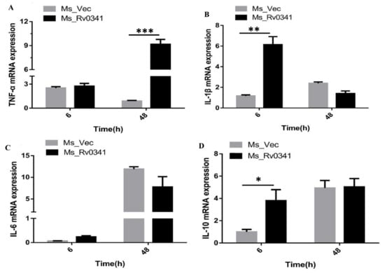 Ms_Rv0341induced cytokine expression. The cytokine transcription of THP-1 macrophages infected with Ms_Rv0341 or Ms_Vec was examined. Total RNA was extracted at 6 and 48 h of post-infection, and subsequently, cDNA was generated and analyzed by quantitative qRT-PCR. (A) TNF-α, (B) IL-1β, (C) IL-6, and (D) IL-10 expressions were calculated after being normalized with expression levels of beta-actin. Asterisks indicate significant difference as * p < 0.05, ** p < 0.01, *** p < 0.001. The experiments were done in triplicates, and similar findings were obtained in three independent experiments.