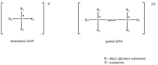 General formulas of the aliphatic quaternary ammonium salts (QAS) with monomeric and the gemini structure.