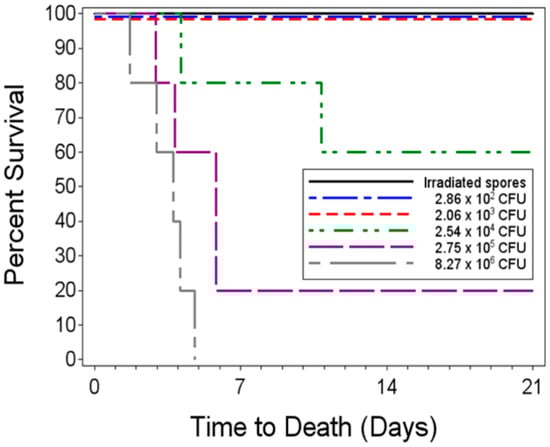 Based on the unadjusted Fisher’s exact tests, the proportions of surviving animals in the irradiated spore group and in the two lowest dose groups (2.8 × 102 CFU and 2.06 × 103 CFU) were significantly greater than those in the 2.75 × 105 and 8.27 × 106 CFU dose groups. Additionally, the 2.54 × 104 CFU dose group showed significantly greater times to death than the highest dose group. However, after adjusting for the multiple comparisons, there were no significant pairwise differences between any of the groups of exposed animals since the multiple comparisons have a more stringent requirement for significance.