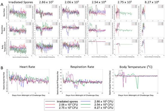 Each rabbit that succumbed to disease showed a pronounced increase in respiration rate (greater than 30 respiratory cycles per minute above baseline) (Figure 2A). When comparing the group mean changes, there were significant increases from baseline in the 2.75 × 105 CFU challenge group from study day 2 at 0600–1200 through study day 5 at 1200–1800 and in the 8.27 × 106 CFU challenge group from study day 2 at 0000–0600 through study day 4 at 1200–1800. These increases ranged from 20 to 30 breaths per minute over baseline values. The mean increase from baseline in these two groups was often significantly different than the mean change from baseline in at least one of the other groups during these study times (p < 0.05 Tukey’s test) (Figure 2B).