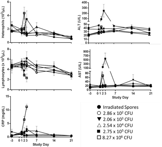 C-Reactive Protein (CRP) is an indicator of stress and non-specific inflammation. CRP can also be used as a marker for liver damage. Individual rabbit clinical chemistry results and group means and standard deviations are provided in Supplementary Table S3. All groups had at least one animal with detectable levels of CRP through study day 3. There were significant increases in CRP in the two highest dose groups (2.75 × 105 CFU and 8.27 × 106 CFU) at study day 3 (p < 0.05, Tukey’s Test) with the 8.26 × 106 CFU group 3.8 times higher than baseline (Figure 3). There was also a significant increase in AST in the 2.75 × 105 CFU and the 8.27 × 106 CFU dose groups on study day 2, and in the 2.75 × 105 CFU dose group at study day 3 (Figure 3). At study day 3, the increase as a proportion of baseline in the 2.75 × 105 CFU dose group showed significantly increased change in ALT, LDH, and SDH when compared to all other groups. Figure 3 shows the levels of AST and ALT for all dose groups.