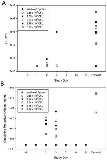 Bacteremia (A) and PA (B) levels after low-dose exposure to B. anthracis. Blood samples were quantitatively plated on tryptic soy agar and serum samples were assayed for PA levels via ELISA. Each dose group is represented by a different symbol. Each symbol on the graph represents an individual animal on the identified study day or the day of the animal’s death for the study day identified as terminal. The circulating levels of PA were below the limit of detection in all rabbits exposed to irradiated spores.