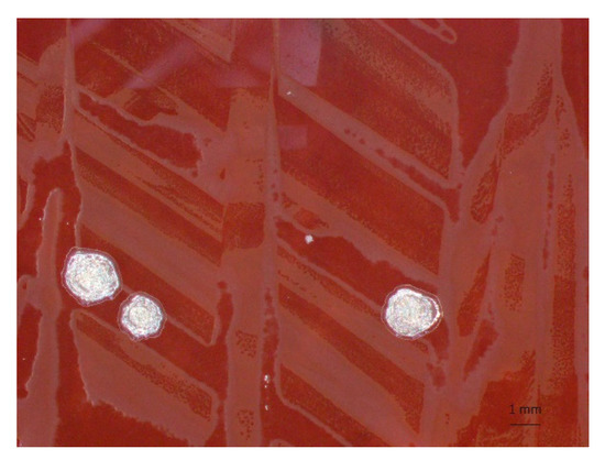 Colonies of Bartonella sp. on a blood agar plate. Bartonella sp. was isolated from Rousettus aegyptiacus (ZB17-79) and cultured on a blood agar plate.