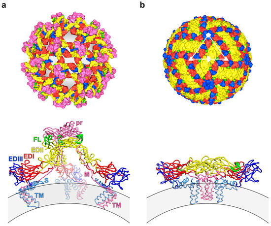 Following uncoating, translation and genome replication, the prM and E proteins are embedded into the endoplasmic reticulum (ER) membrane and enclose the newly formed nucleocapsid as it buds into the lumen of the ER, forming an immature viral particle [58,59]. The immature dengue virion has a rough surface with 60 spikes, each formed by three prM–E heterodimers in which the precursor (pr) peptide of the prM protein caps the FL located at the distal end of each E protein monomer [38,60,61] (Figure 1a). During export, the low-pH environment of the trans-Golgi network (TGN) triggers the rearrangement of prM–E heterodimers into a flattened conformation, exposing a cleavage site at the pr-M junction that is recognised by the host protease furin [62,63]. The cleaved pr peptide remains associated with the E protein under acidic conditions, preventing premature fusion [64,65]. Upon release into the extracellular milieu, the neutral pH induces the dissociation of the pr peptide from the viral particle, completing the virion maturation process [65].