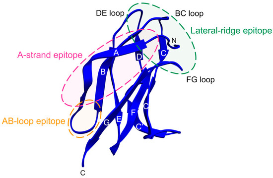 Major antigenic regions on EDIII. Ribbon diagram of EDIII, extracted from the cryo-EM structure of the mature DENV1 particle (PDB 4CCT), with the three main epitopes defined by mouse mAbs circled by dashed lines. Secondary structure assignments and labels according to previous models [182]. Molecular graphics were prepared with UCSF Chimera [75].