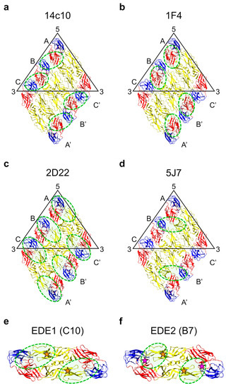 Quaternary epitopes recognised by strongly neutralising human mAbs. (a–d) Serotype-specific epitopes on the E protein raft bound by human mAbs 14c10 (DENV1) [231] (a), 1F4 (DENV1) [107,110,232] (b), 2D22 (DENV2) [107,108,233] (c), and 5J7 (DENV3) [107,108,235] (d). The epitopes are circled by green dashed lines. The black triangle represents an icosahedral asymmetric unit and the numbers indicate the vertices. The three E protein molecules in the asymmetric unit are labelled as A, B and C, respectively, and those in the neighbouring asymmetric unit, A’, B’ and C’, respectively. (e,f) Cross-reactive epitopes on the E protein dimer bound by E protein dimer epitope 1 (EDE1)-specific mAbs (here: mAb C10) (e) and EDE2-specific mAbs (here: mAb B7) (both [71,236]) (f). The epitopes are circled by green dashed lines. The glycosylation sites on Asn67 are marked as orange stars. Moreover, to highlight the sensitivity of EDE2-specific mAbs to glycosylation at Asn153, these sites are marked as pink stars only in f. Structures of the different E protein arrangements were extracted from the cryo-EM structure of the mature DENV1 particle (PDB 4CCT) and molecular graphics were prepared with UCSF Chimera [75] (a–f).