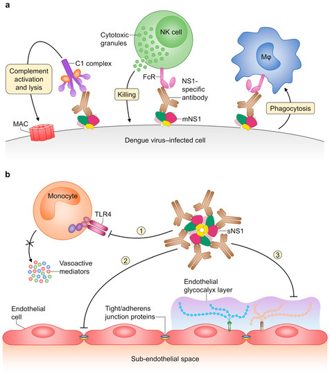 Immunisation with purified NS1 [102] or passive transfer of NS1-specific antibodies [287] was shown to prevent lethal DENV2-induced encephalitis in mice. The protective effects of DENV NS1–specific antibodies were initially attributed to their ability to promote complement-mediated cytotoxicity, based on prior experiments with YFV NS1–specific antibodies [288] and the finding that antibodies unable to fix complement did not confer protection [102,287]. More recently, antibody recognition of membrane-associated NS1 has been shown to activate additional Fc-mediated effector functions, namely antibody-dependent cellular cytotoxicity [289,290] and antibody-dependent cellular phagocytosis [291], contributing to both lysis and clearance of infected cells (Figure 6a). Furthermore, NS1-specific antibodies also bind sNS1 in circulation and neutralise its vasoactive effects, as demonstrated in a mouse model of NS1-induced vascular leakage [262] (Figure 6b). Given the multiple roles of NS1 in dengue pathogenesis, additional studies are needed to delineate the exact mechanisms of protection mediated by NS1-specific antibodies.