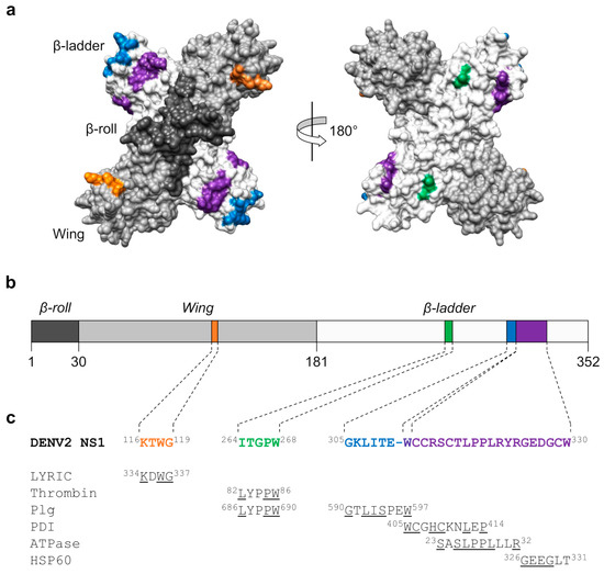 Efforts were undertaken to identify the molecular determinants of host cross-reactivity (see Figure 7), in order to obviate such undesirable responses being induced by future NS1 subunit vaccines. Antibodies generated against ELK/KLE-type motifs in NS1 were shown to bind to similar epitopes in host molecules [280,301]. In addition, several host cross-reactive epitopes have been found in the C-terminal region of NS1 (aa 271–352) [307,314]. In particular, amino acid residues 311–330 of NS1 form an immunodominant region that shares sequence homology with a number of proteins expressed on human endothelial cells or platelets, such as protein disulphide isomerase, ATPase, and heat shock protein 60 [306,315]. In addition, two epitopes suggested to be responsible for antibody cross-reactivity with human coagulation factors have been mapped to amino acid residues 264–268 and 305–311 of NS1 [308,309,310]. Furthermore, a KXWG motif located in the immunodominant disordered loop of the NS1 WD (aa 116–119) has been shown to induce antibodies that cross-react with lysine-rich CEACAM1 co-isolated (LYRIC) on human endothelial cells [316].