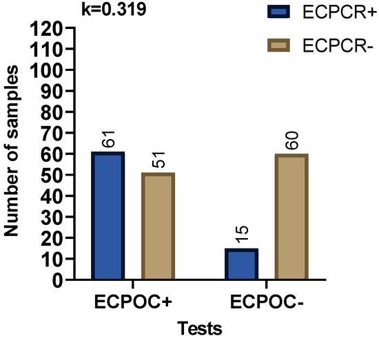 Comparison of agreement between POC test results and PCR for the diagnosis of E. canis (EC) infection. Fisher’s exact test was used for comparisons, and Cohen’s Kappa value was calculated. Observed Kappa (k) value shown on the graph is interpreted, as agreement between tests is “fair.”. ECPCR: E. canis PCR; ECPOC: E. canis POC.