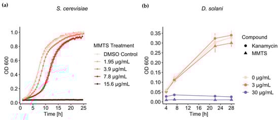 (a) Growth curves of S. cerevisiae exposed to 1.95–15.6 µg/mL MMTS in liquid culture. Points represent average OD600 of three replicates at a given time point and concentration. Error bars correspond to standard error. Significant differences between growth curves are represented in Figure S4a; (b) growth curve of D. solani exposed to 0, 3 or 30 µg/mL of MMTS in comparison to kanamycin at the same concentrations. Symbols indicate average OD595 for a given time point, concentration and compound of 3 replicates. Error bars represent standard error. No significant differences between growth curves of bacteria treated with kanamycin or MMTS could be observed (Figure S4b).